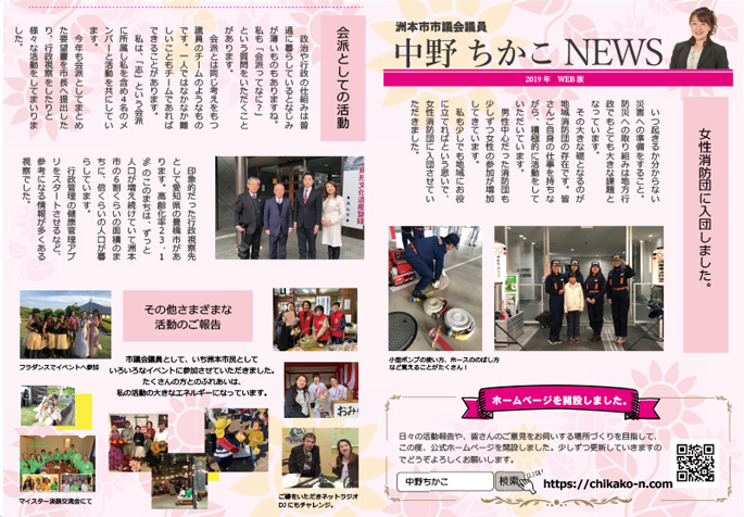 中野ちかこニュースvo.3 中野ちかこNEWS、活動報告 日々の活動をまとめ、ニュース形式でご報告させていただいております。 こちらから閲覧・ダウンロードをしていただけます。 中野ちかこニュースvo.3 議会で私たちが行う代表質問の内容や取り組みにつきましてはこちらで詳しくご確認いただけます。 すもと市議会だよりへ