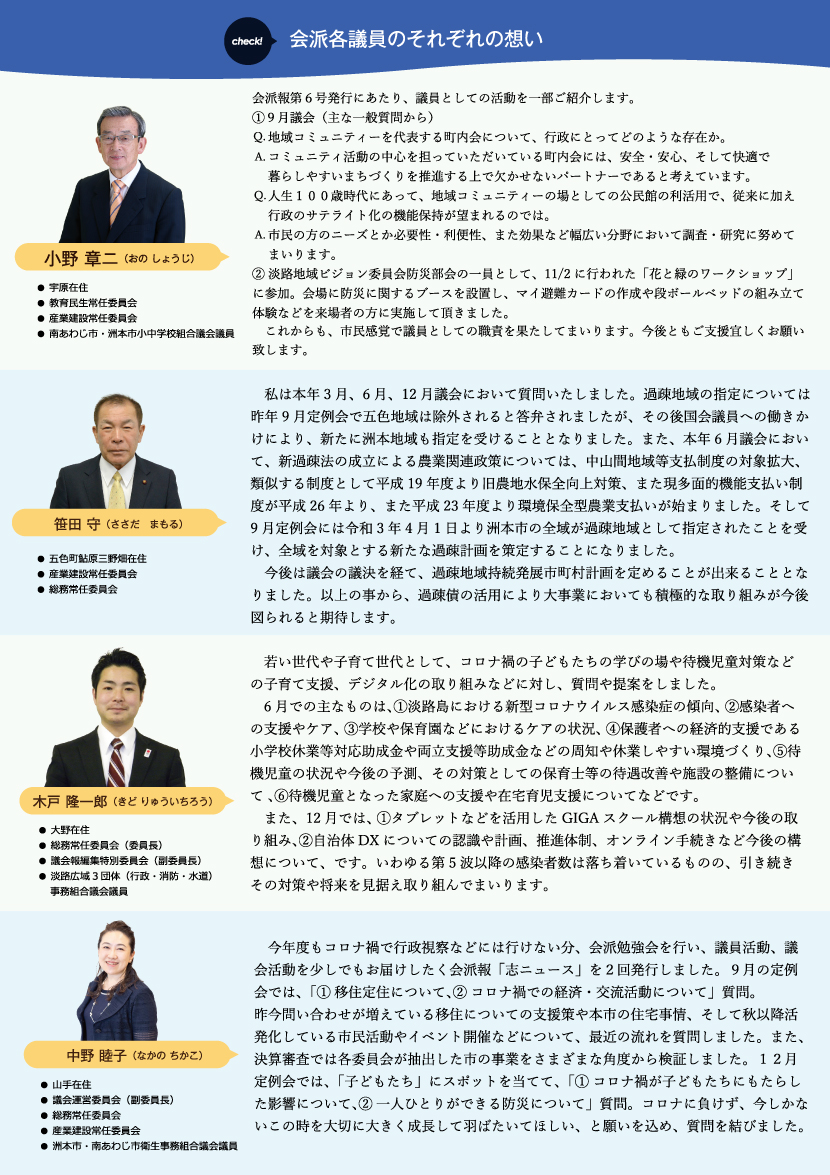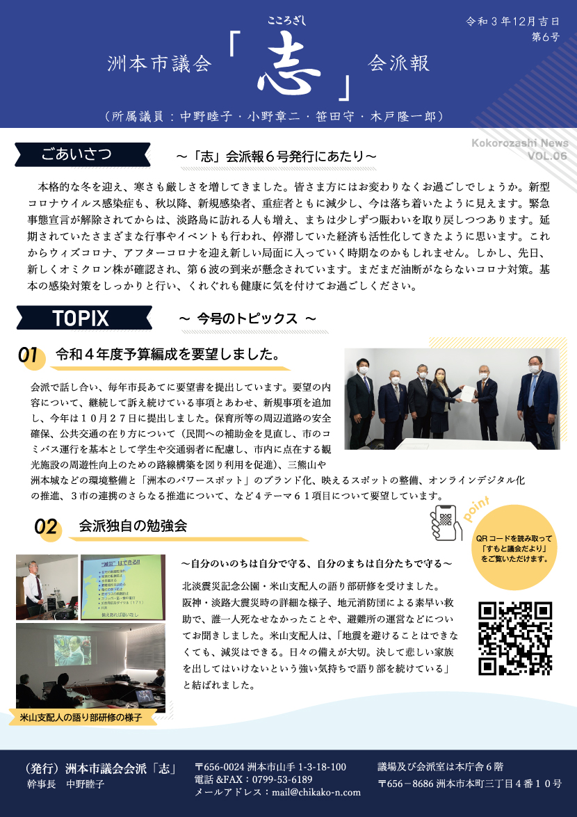 会派「志」会派報 vol.6を発行しました 会派活動、活動報告 会派「志」会派報「Kokorozashi News」vol.6を発行し、今回も洲本市内全紙に折りこみをさせていただきました。 会派報は、会派での活動や、思い、施策の進捗状況のご報告をさせていただくために、定期的に発行をさせていただいております。 今回もQRコードは、議会報「みんなのぎかい」にリンクをしています。 ご希望の方にはお送りしますのでメッセージでお知らせくださいませ🌺
